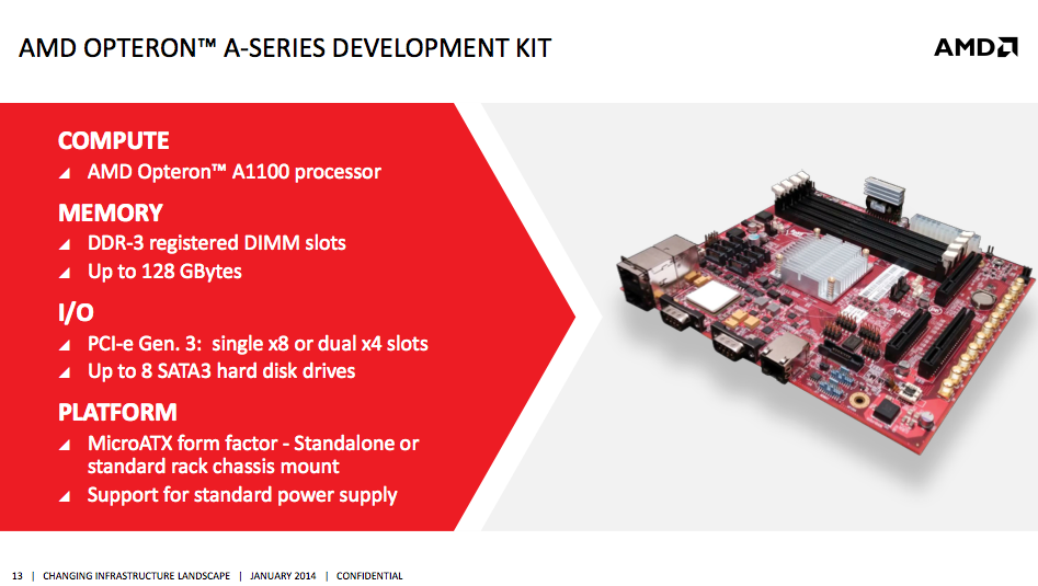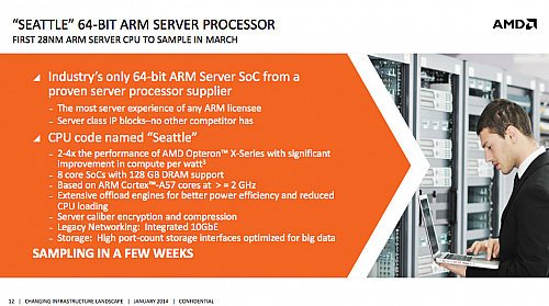 Η AMD έθεσε σε άμεση διαθεσιμότητα τη σειρά AMD Opteron A1100, ένα πακέτο για προγραμματιστές που περιλαμβάνει τον πρώτο 64bit ARM επεξεργαστή της εταιρίας με κωδικό όνομα "Seattle" και είναι η πρώτη server πλατφόρμα που βασίζεται σε ARM Cortex A57 επεξεργαστή.