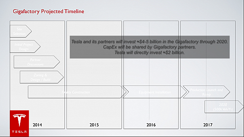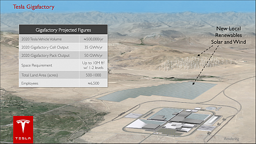 Το εργοστάσιο αυτό ονομάζεται Gigafactory και ενδέχεται να απασχολήσει περί τους 6.500 εργαζόμενους σε μια έκταση αρκετά μεγαλύτερη των 2.000 στρεμμάτων. Τα χρήματα που θα επενδυθούν για την κατασκευή του θα ξεπεράσουν τα 4 δισεκατομμύρια δολάρια ενώ η γραμμή παραγωγής του από το 2020 και μετά θα ανέρχεται σε μπαταρίες που θα μπορούν να τροφοδοτήσουν ετησίως μέχρι 500.000 αυτοκίνητα της Tesla, αριθμός μεγαλύτερος απ' ότι όλη η παγκόσμια παραγωγή του 2013!
