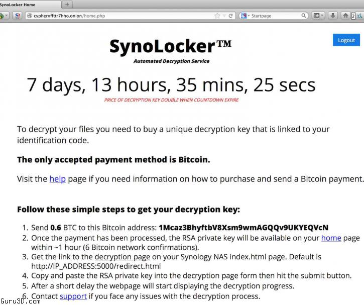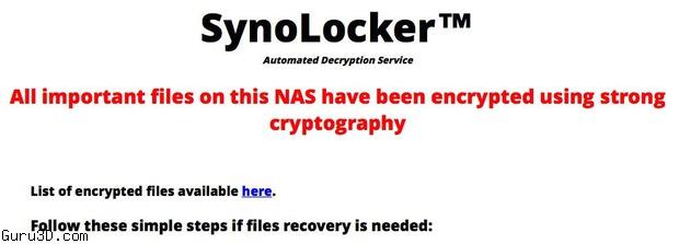 Πολλοί χρήστες των δημοφιλών Synology NAS παραπονέθηκαν ότι to NAS τους μολύνθηκε με ransomware, ένα κακόβουλο λογισμικό που κρυπτογραφεί τα δεδομένα των χρηστών και έτσι τα καθιστά μη προσβάσιμα. Ένα τέτοιο πρόγραμμα με το όνομα Synolocker κρυπτογραφεί όλα τα δεδομένα στο NAS Server και ζητάει εκατοντάδες ευρώ για να αντιστρέψει τη διαδικασία και να τα παραδώσει πίσω στο ιδιοκτήτη τους. Στο Synology forum, χρήστες αναφέρουν ότι έχουν πέσει θύμα του synolocker και είναι αναγκασμένοι να πληρώσουν 0,6 Bitcoin ή αλλιώς 260 € σε μια ιστοσελίδα που τρέχει μέσω του TOR. Δυστυχώς δεν υπάρχουν αναφορές για το αν οι χρήστες που έχουν πληρώσει, έχουν πάρει τελικά τα δεδομένα τους πίσω.