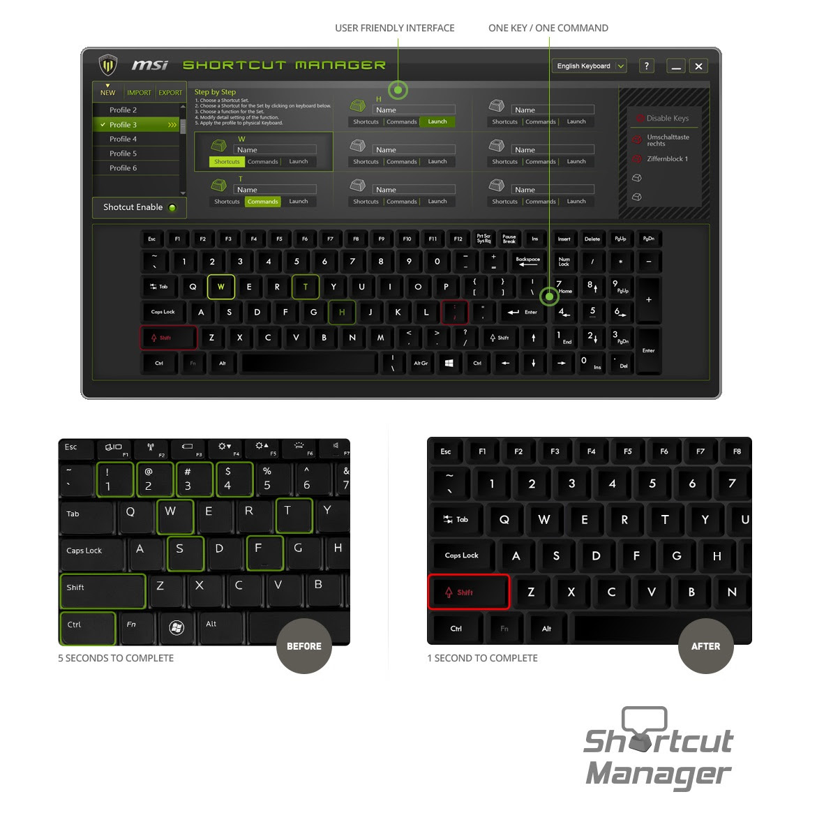 Επιπλέον διαθέτει SteelSeries full-color backlight keyboard με Anti-Ghost keys, Killer Game Networking chip και τον Shortcut Manager της MSI, που επιτρέπει ένας συνδυασμός πλήκτρων να αντικατασταθεί με ένα απλό command key, αυξάνοντας την ταχύτητα και την αποτελεσματικότητα του κατόχου του μηχανήματος στην εργασία του.