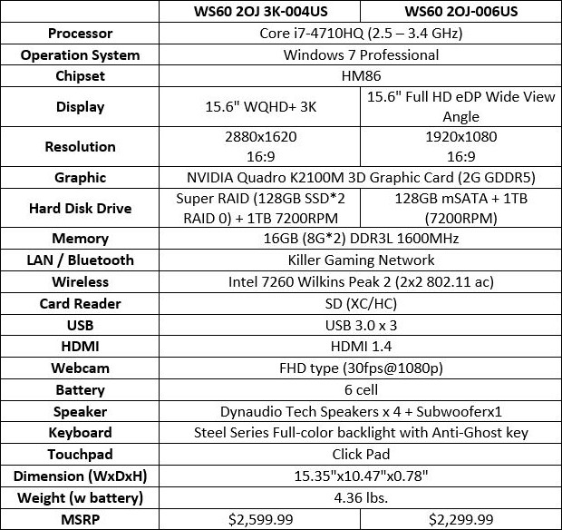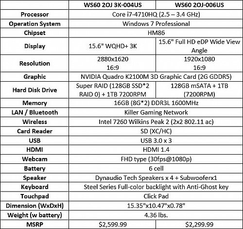 Το WS60 είναι διαθέσιμο σε δύο εκδόσεις. Η μία έκδοση των $2600 δολαρίων διαθέτει 2 SSDs και 15,6'' WQHD+ 3K display, ενώ η δεύτερη έκδοση των $2300 δολαρίων έρχεται με μόνο έναν SSD και οθόνη 15,7'' Full HD eDP Wide View Angle.