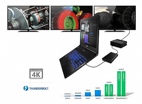 Στα specs βρίσκουμε έναν 4ης γενιάς επεξεργαστή της Intel, μια Nvidia Quadro 2100 και το Super RAID της MSI που ενσωματώνει δύο SSDs σε RAID 0 και έναν μηχανικό σκληρό δίσκο για υψηλές επιδόσεις. Όσον αφορά το Thunderbolt 2, έρχεται με 4K και 3D video output και ταχύτητες μεταφοράς δεδομένων της τάξης των 20GB/sec.