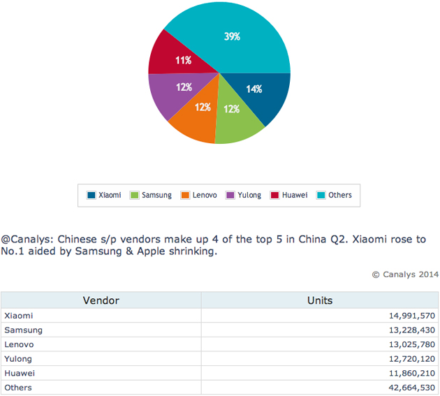 Η Xiaomi είναι ένας από τους πρωτοπόρους στον τομέα της πώλησης συσκευών σε κοντά κόστος, και είναι δικαιολογημένη η άνοδός της στο Νο.1 μετά την επιτυχημένη κυκλοφορία της σειράς Redmi. Έτσι λοιπόν κατάφερε να έχει 15 εκατομμύρια πωλήσεις στο Q2, ενώ συνολικά πούλησε 26,1 εκατ. συσκευές στο πρώτο εξάμηνο του τρέχοντος έτους, και ο στόχος της είναι να τελειώσει το 2014 με πωλήσεις, πάνω από 60 εκατομμύριων συσκευών.