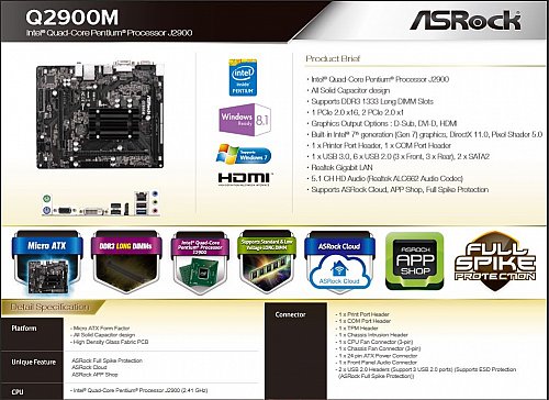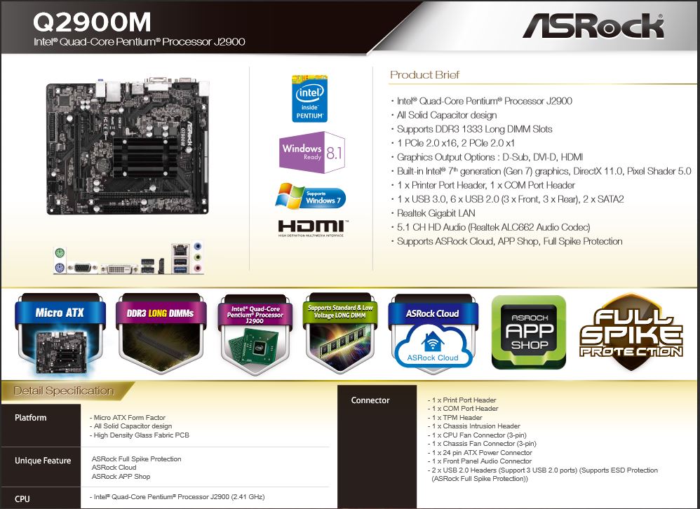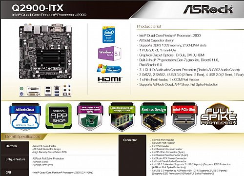 Η Q2900-ITX είναι μια ITX μητρική με δύο SO-DIMM DDR3 υποδοχές, δύο SATA 6Gbps και δύο SATA 3Gbps θύρες, τέσσερις θύρες USB 3.0 και τέσσερις USB 2.0, μια υποδοχή PCIe 2.0 x1, μια υποδοχή mini-PCIe (για WiFi) και τρεις τυπικές εξόδους βίντεο (VGA, DVI-D, HDMI) και 8-channel HD audio.