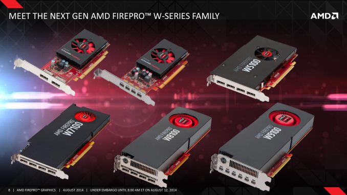Πρόκειται για τις FirePro W7100, FirePro W5100, FirePro W4100 και FirePro W2100. Οι κάρτες αυτές βασίζονται σε μια πλειάδα πυρήνων συμπεριλαμβανομένου και του Tonga που είναι η πρώτη φορά που το συναντάμε σε οποιοδήποτε μοντέλο της AMD. Οι κάρτες στοχεύουν στην αγορά κάτω των $2500 δολαρίων όπου βρίσκουμε το W8100. Με τις νέες κάρτες η AMD επιχειρεί ως επί τον πλείστον να καταστήσει την σειρά FirePro κατάλληλη για 4Κ επεξεργασία, να βελτιώσει τις επιδόσεις σε σχέση με τα παλαιότερα μοντέλα σε όλες τις κατηγορίες τιμών, ενώ προσφέροντας διπλάσια VRAM να τις καταστήσει κατάλληλες να χρησιμοποιηθούν με μεγαλύτερα data sets.