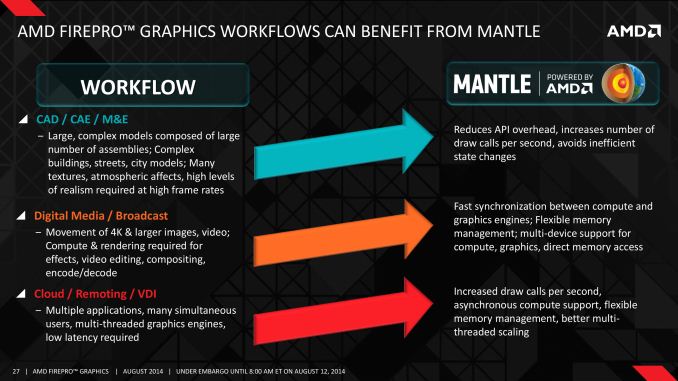 Τέλος, να πούμε ότι μαζί με τις κάρτες η AMD ανέφερε ότι σκοπεύει να φέρει το Mantle και στην επαγγελματική αγορά, πιθανόν ελπίζοντας κάποια από τα πλεονεκτήματα που βλέπουμε από το API στα 3D graphics των games να τα δούμε και στις επαγγελματικές εφαρμογές. Βέβαια ακριβώς επειδή μιλάμε για επαγγελματική αγορά και το Mantle θεωρείται ακόμα under development, ενδεχομένως να πάρει αρκετό χρόνο αυτό το εγχείρημα.