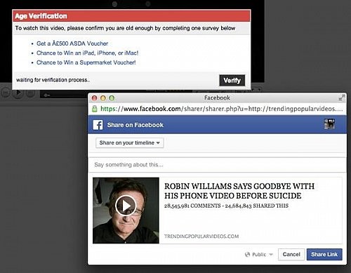 Η συγκεκριμένη ηλεκτρονική απάτη η οποία διαδόθηκε σε όλο το Facebook, ισχυρίζεται ότι προβάλλει το αποχαιρετιστήριο βίντεο που κατέγραψε ο ίδιος ο Robin Williams πριν αυτοκτονήσει την περασμένη εβδομάδα. Ωστόσο, όταν οι χρήστες του Facebook κάνουν κλικ στο σύνδεσμο, ενημερώνονται ότι πρέπει να κάνουν κοινή χρήση (share) του συνδέσμου με τους online φίλους τους και να συμπληρώσουν ένα ερωτηματολόγιο πριν μπορέσουν να δουν το βίντεο. Κάθε φορά που συμπληρώνεται το σχετικό ερωτηματολόγιο, οι απατεώνες κερδίζουν ένα μικρό χρηματικό ποσό.
