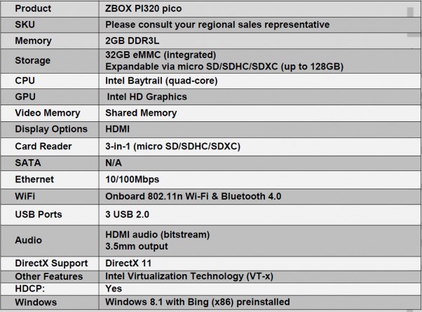 Ένα νέο mini PC παρουσίασε η Zotac. Πρόκειται για το ZOTAC ZBOX PI320 pico το οποίο βασίζεται σε ένα quad core Atom Z3735F Bay Trail στα 1.33GHz (1,83GHz turbo) και έρχεται με εγκατεστημένα τα Windows 8.1 with Bing. Όπως χαρακτηριστικά λέει και η Zotac, πρόκειται για ένα PC που μπορεί να χωρέσει στην τσέπη του κατόχου του.