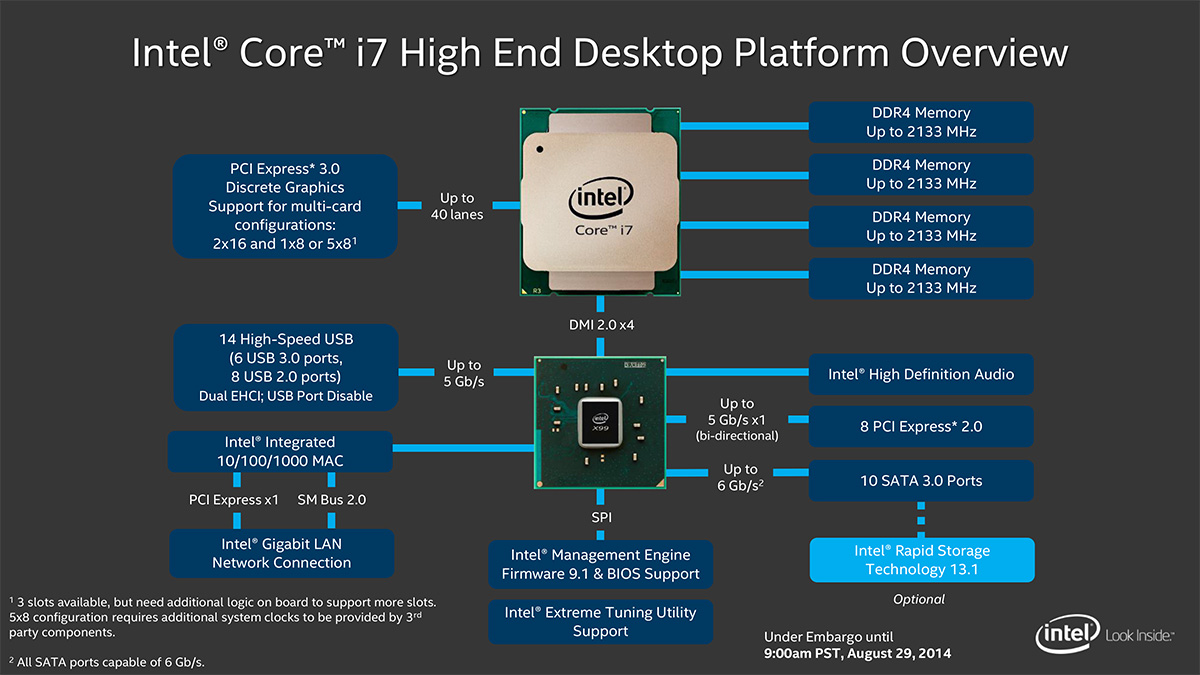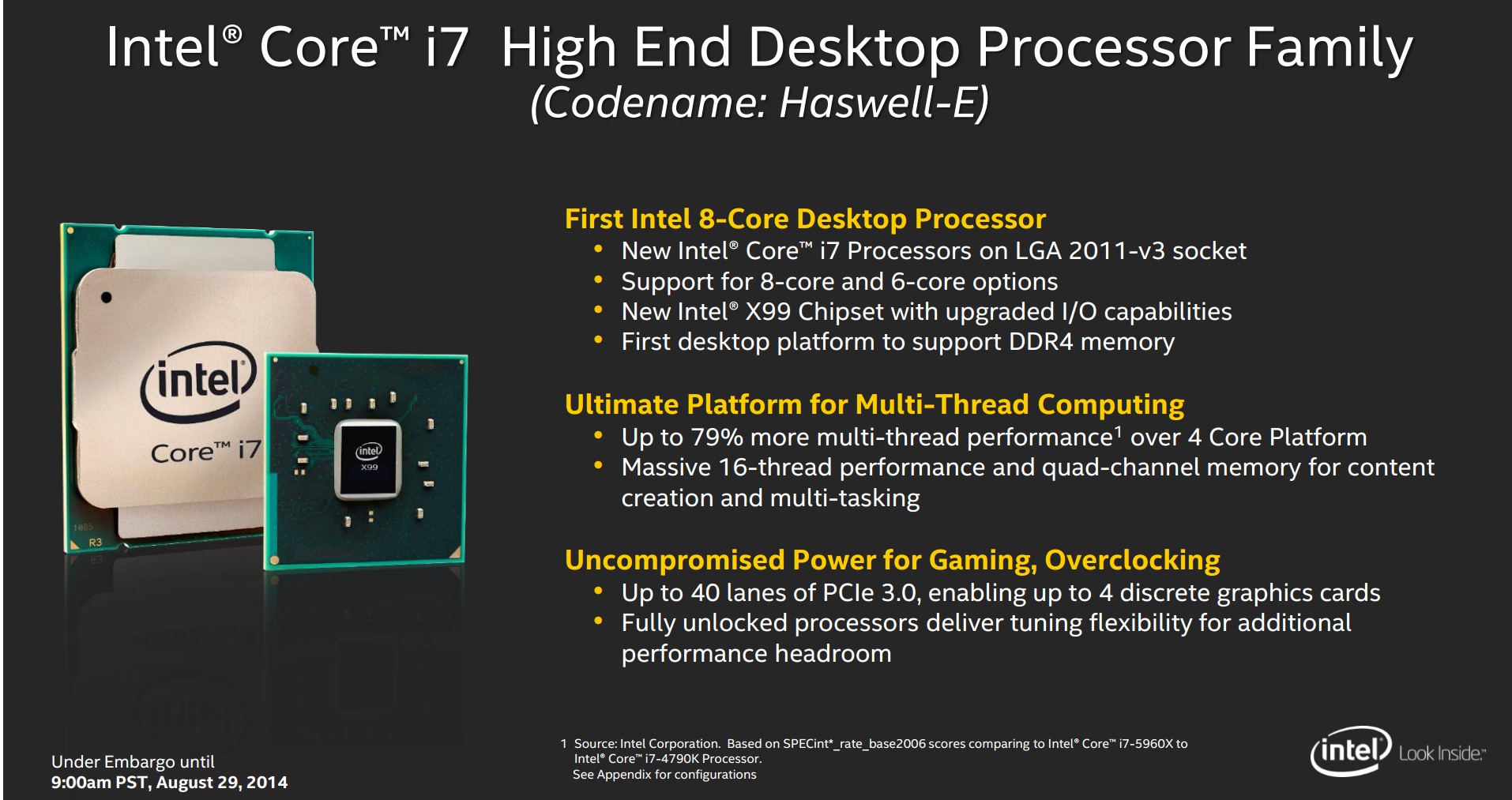 Η Intel ανακοίνωσε και επίσημα σήμερα την νέα της πλατφόρμα Core i7-5000 η οποία αποτελείται από επεξεργαστές i7 σχεδιασμένους για το socket LGA2011-V3 και τις αντίστοιχες συμβατές μητρικές που βασίζονται στο X99 Express chipset της εταιρίας.
