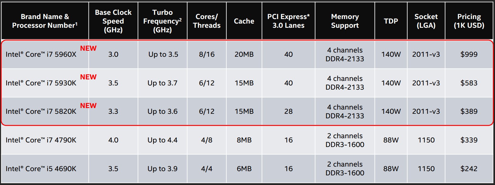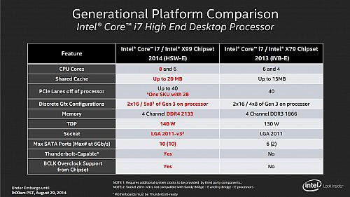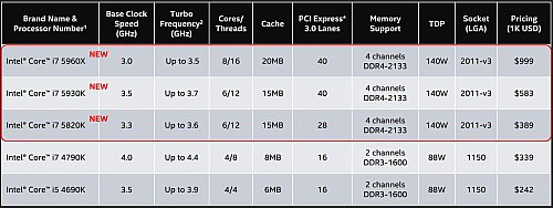 Οι νέοι επεξεργαστές της πλατφόρμας Haswell-E που αποκαλύπτονται σήμερα διαθέτουν έξι ή οκτώ πυρήνες οι οποίοι χάρη στο Hyperthreding μπορούν να επεξεργαστούν μέχρι και δώδεκα ή δεκαέξι threads αντίστοιχα. Έχουν 15 έως 20MB cache και συχνότητες λειτουργίας από 3 έως 3,5GHz σε λειτουργία Turbo. Τα τεχνικά τους χαρακτηριστικά εν συντομία, καθώς και τις τιμές στις οποίες θα διατεθούν, μπορούμε να τα δούμε στον παρακάτω πίνακα