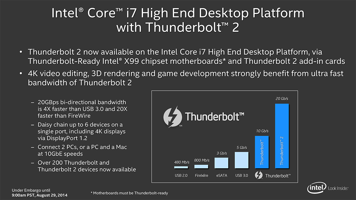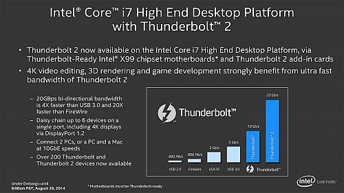Μια ιδιαιτερότητα του νέου chipset είναι ότι αν και υποστηρίζει μέχρι και δέκα SATA 3 υποδοχές, μόνο οι έξι υποστηρίζουν RAID. Με το X99 έχουμε για πρώτη φορά διαθεσιμότητα για συνδεσιμότητα Thunderbolt 2 στην E-class πλατφόρμα, αλλά με χρήση πρόσθετης κάρτας, με την ASUS να είναι η μόνη για την ώρα που κατασκευάζει τέτοιες κάρτες.