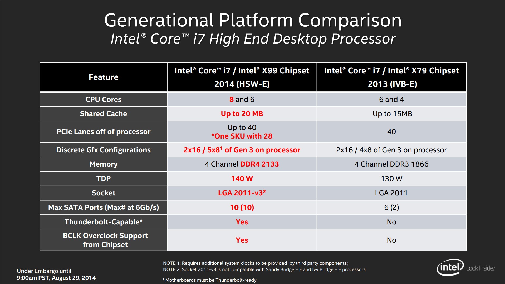 Μια σύγκριση με το X79 που χρησιμοποιούσε η αντίστοιχη πλατφόρμα Ivy Bridge-E, μπορείτε να δείτε στην παρακάτω εικόνα