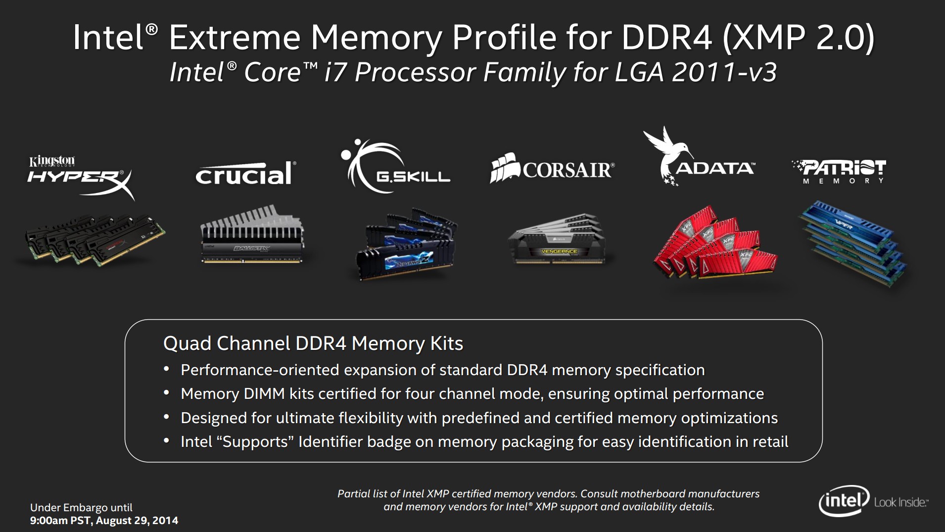 Ντεμπούτο κάνουν βέβαια και οι DDR4 μνήμες στο desktop, αφού η νέα πλατφόρμα της Intel είναι και η πρώτη που τις υποστηρίζει. Οι επεξεργαστές αναφέρεται ότι υποστηρίζουν quad channel DDR4-2133 με timings 15-15-15, αλλά ήδη κυκλοφορούν ή έχουν ανακοινωθεί μνήμες με ταχύτητες DDR4-3200 με CL16.