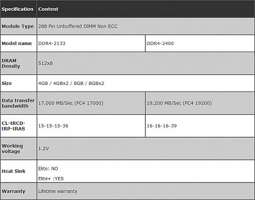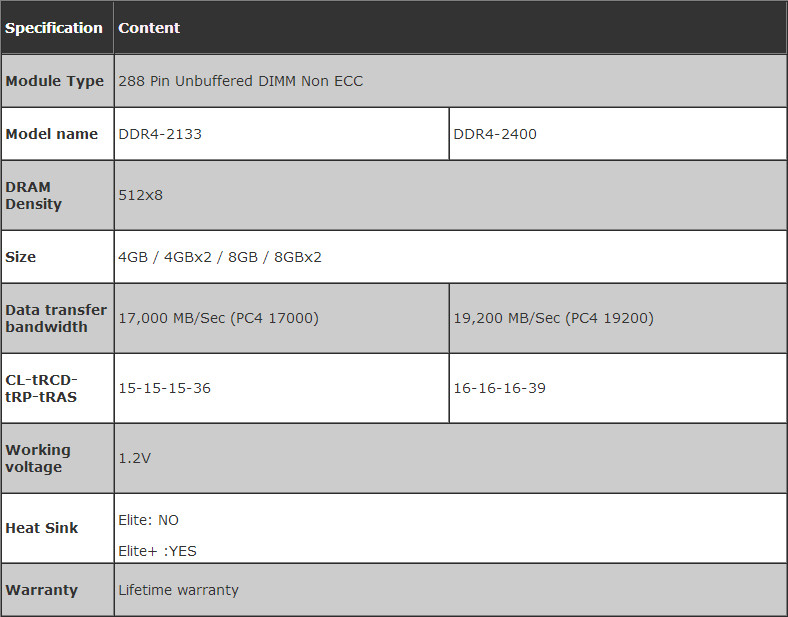 Με εγγύηση εφ' όρου ζωής προσφέρει στους πελάτες της μια άριστη εμπειρία στην νέα πλατφόρμα υψηλών ταχυτήτων. Αντίθετα από τις DDR3, οι νέες DDR4 λειτουργούν στη χαμηλότερη τάση των 1.2 V και έχουν μεγαλύτερη επεκτασιμότητα από τις DDR3 (μέχρι 64 GB σε quad channel). Οι μνήμες της σειράς Elite είναι χρονισμένες στα 2133 με 15-15-15-36 timings ενώ οι Elite+ στα 2400 με 16-16-16-39 timings. Είναι διαθέσιμα σε τέσσερις εκδόσεις των 4 GB/8 GB/8 GB Kit/16 GB σετ.
