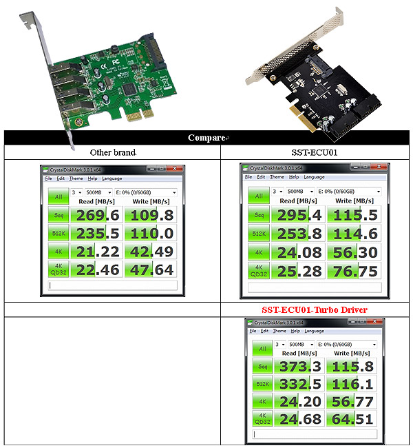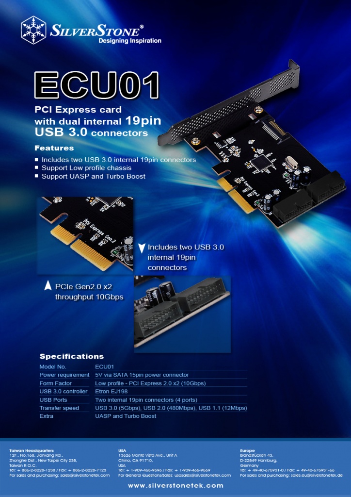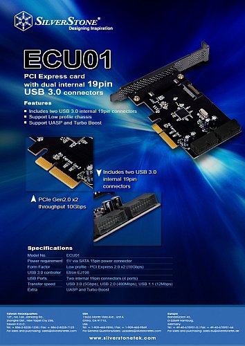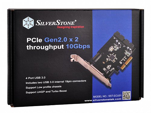 Η Silverstone ECU01 είναι η πρώτη κάρτα επέκτασης PCI-E Gen 2.0 X2 με 2 εσωτερικούς connectors USB3 των 19 pins. Χρησιμοποιώντας το εύρος των 10 Gbps προσφέρει πιο σταθερή και γρήγορη μεταφορά δεδομένων όταν πολλές συσκευές είναι συνδεδεμένες ταυτόχρονα σε USB θύρες. Η ECU01 υποστηρίζει το πρωτόκολλο UASP (USB Attached SCSI Protocol) και ένας ειδικός "turbo Boost" driver παρέχει αυξημένη απόδοση κάνοντας την ECU01 την καλύτερη επιλογή για όποιον ψάχνει να επεκτείνει την συνδεσιμότητα USB3 του υπολογιστή του. Η προτεινόμενη τιμή είναι 30,45 δολάρια συν το ΦΠΑ και θα είναι διαθέσιμο από τις 15 Σεπτεμβρίου.