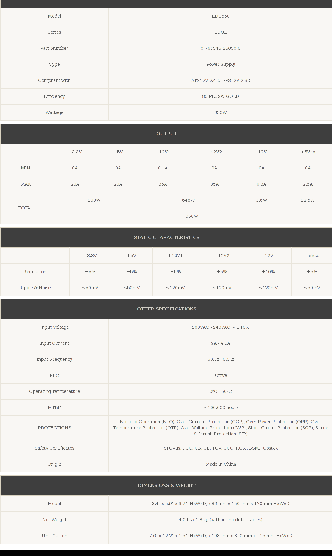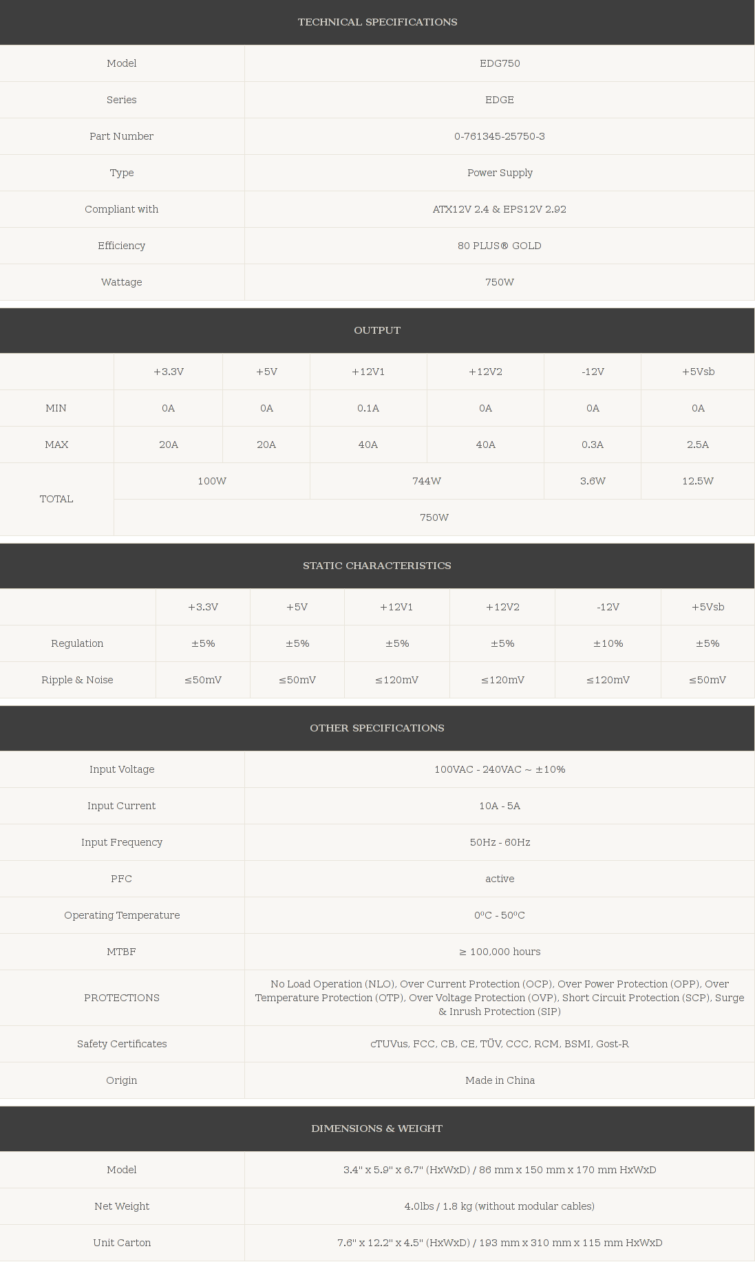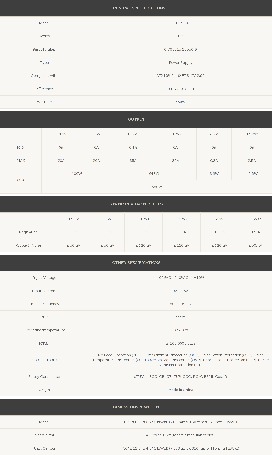 Η σειρά EDGE είναι Haswell και C7 ready και συμβαδίζει με τα πρότυπα ATX12V 2.4 και EPS12V 2.92. Όπως αναφέραμε εξ αρχής, όλα τα μοντέλα είναι fully modular και έχουν πιστοποίηση απόδοσης 80 PLUS® GOLD φτάνοντας έως και 92% ωφέλιμης ισχύος από αυτή που η μονάδα καταναλώνει. Τα δύο, υψηλής απόδοσης 12V rails εξασφαλίζουν την απρόσκοπτη τροφοδοσία ακόμα και των πιο ενεργοβόρων επεξεργαστή και κάρτας γραφικών ενώ η ασφάλεια των κυκλωμάτων είναι βιομηχανικού επιπέδου, εξασφαλίζοντας έτσι τα υποσυστήματα του υπολογιστή από τις διακυμάνσεις του ηλεκτρικού ρεύματος. Η Antec έχει προσθέσει υποδοχές των 18 + 10 pins (MBU) για μελλοντικά πρότυπα τροφοδοσίας της μητρικής καθώς και των 16 pins για τη χρησιμοποίηση δύο διαφορετικών 8-pin ή τη μελλοντική υποστήριξη 10-pin, 12-pin, 14-pin ή 16-pin υποδοχών τροφοδοσίας.