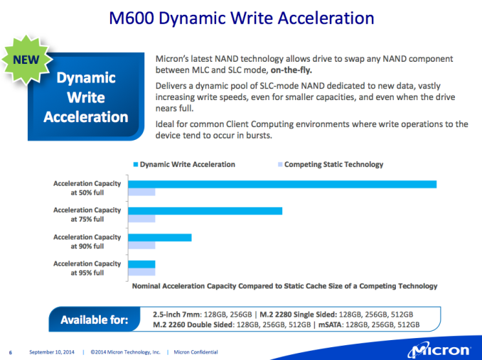 Η τεχνολογία Dynamic Write Acceleration έρχεται να διορθώσει το πρόβλημα χαμηλής ταχύτητας εγγραφών που είχαν τα μικρότερα μοντέλα της σειράς Micron Crucial M550. Σε αντίθεση με άλλες τεχνολογίες που χρησιμοποιούν μικρά προκαθορισμένα τμήματα της μνήμης σε SLC mode ως cache, η τεχνολογία DWA είναι δυναμική επιτρέποντας στην μνήμη να δουλεύει τόσο σε SLC όσο και σε MLC mode, με την εναλλαγή να γίνεται αυτόματα κατά την λειτουργία. Με τον τρόπο αυτό ο κάτοχος του SSD απολαμβάνει υψηλότερες ταχύτητες και παράλληλα μικρότερη κατανάλωση ενέργειας. Χάρη στην DWA, το μοντέλο των 128GB επιτυγχάνει ταχύτητες της τάξης των 410MB/sec σε sequencial writes και 88K random write IOPS, όταν το μοντέλο M550 των 128GB ήταν περιορισμένο στα 190MB/sec. Η DWA χρησιμοποιείται μόνο στα δύο μικρότερα 2,5” SATA μοντέλα, των 128GB και 256GB όπου και υπάρχει η μεγαλύτερη ανάγκη, καθώς επίσης και σε όλα τα mSATA μοντέλα. Στα M.2 DWA υποστηρίζουν τα μοντέλα των 128GB, 256GB και 512GB.