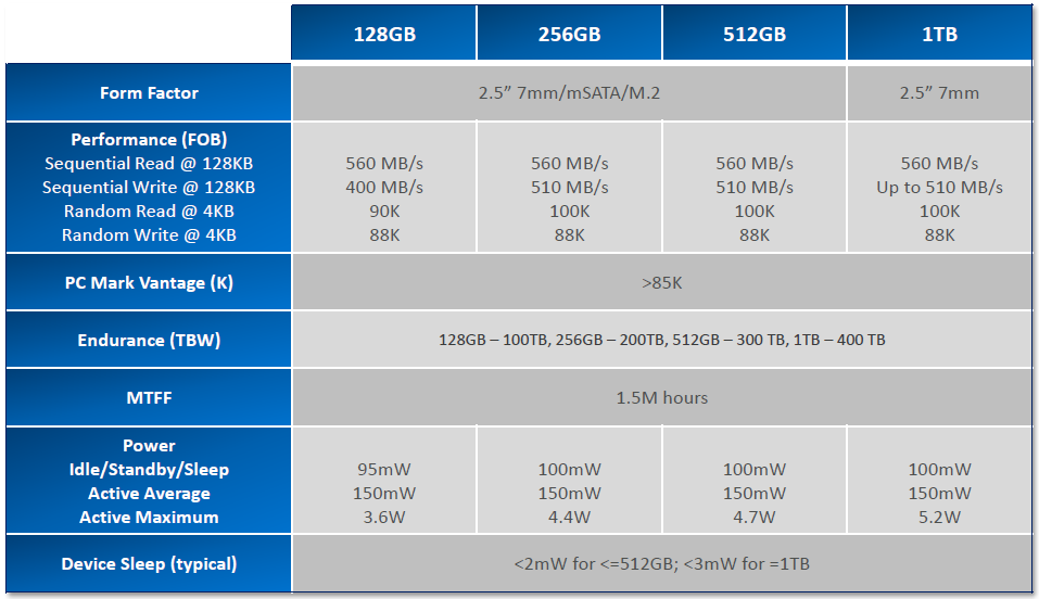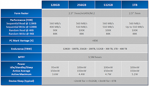 Αυξημένη είναι και η αντοχή στον χρόνο σε σχέση με τα παλαιότερα μοντέλα. Έτσι το μοντέλο των 128GB έρχεται rated στα 100TB εγγραφές ενώ το μοντέλο του 1TB φτάνει τα 400TB.