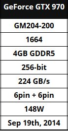 Όσον αφορά την GTX 970 τα τεχνικά της χαρακτηριστικά είναι ακόμα υποθετικά, σε αντίθεση με αυτά της GTX 980 που θεωρούνται πάνω κάτω πιο σίγουρο ότι θα είναι αυτά που αναγράφονται στον παραπάνω πίνακα. Έτσι η GTX 970 αναμένεται να έχει 1664 CUDA cores, αλλά να διατηρεί τα 4GB GDDR5 μνήμης και το 256bit data bus. Η κατανάλωσή της δεν θα υπερβαίνει τα 150W.