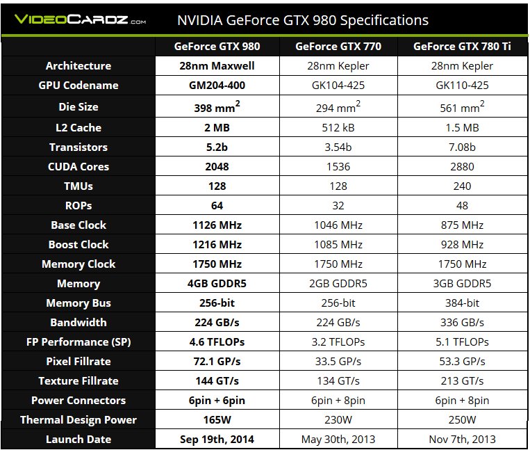 Η GTX 980 θα διαθέτει 2048 CUDA cores, 128 TMUs και 64 ROPs. Θα είναι εξοπλισμένη με 4GB GDDR5 και η επικοινωνία της GPU με την μνήμη θα γίνεται μέσω ενός data bus των 256Bit, οπότε το bandwidth που θα επιτυγχάνει θα είναι της τάξης των 224GB/sec. Η συχνότητα της GPU είναι στα 1126MHz base και 1216MHz turbo. Η κάρτα θα διαθέτει συνολικά πέντε εξόδους εικόνας DVI-I, HDMI 2.0 και τρεις DisplayPorts 1.2(και όχι 1.3). Το πιο εντυπωσιακό όμως από όλα τα νέα χαρακτηριστικά της όμως είναι το TDP της. Μόλις 165W. Σε σχέση με τα 250W του GK110-425 και με βάση το ότι μιλάμε για τα ίδια νανόμετρα, είναι προφανές ότι η Nvidia έχει κάνει εξαιρετική δουλειά σε αυτόν τον τομέα, κάτι που είχαμε ήδη διαπιστώσει με το GM107, αλλά πρώτη φορά βλέπουμε σε κάρτες υψηλών επιδόσεων.