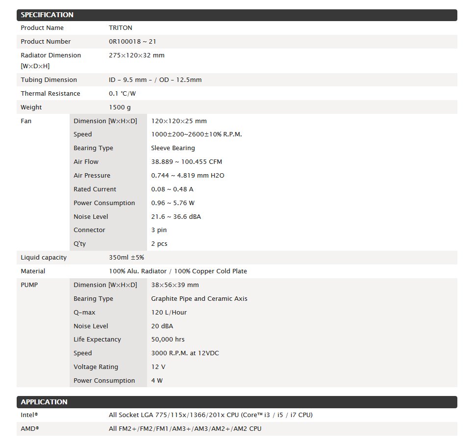 Το χάλκινο μπλοκ του Triton, ακολουθάει μια νέας αντίληψης σχεδίαση με micro channels, αυξημένου μεγέθους contact fins και διπλής ροής σύστημα για την εξασφάλιση της καλύτερης ροής του υγρού. Η αντλία του Triton είναι επίσης εντελώς νέας και αποκλειστικής σχεδίασης, ιδιαίτερα αξιόπιστη, με υψηλό Q-Max και χαμηλό επίπεδο θορύβου, σε συνδυασμό με ένα ρεζερβουάρ το οποίο διαθέτει δύο LEDS εσωτερικά για καλύτερο οπτικό αποτέλεσμα. Το ψυγείο του Triton ακολουθάει σχεδίαση με υψηλής πυκνότητας fins.