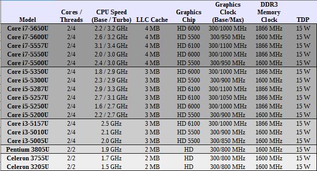 Τα νέα μοντέλα θα είναι χωρισμένα σε i7, i5, i3, Pentium και Celeron. Η κύρια διαφορά των Pentium και Celeron θα είναι ότι δεν θα διαθέτουν Hyperthreading και άρα θα περιορίζονται σε δύο μόνο threads. Επίσης δεν θα διαθέτουν Turbo κάτι που θα ισχύει και για τα i3 μοντέλα, που όμως θα διαθέτουν Hyperthreading. Όσον αφορά την ενσωματωμένη cache αυτή θα είναι 2, 3 ή 4MB ανάλογα το μοντέλο. Μνήμη θα υποστηρίζεται DDR3 1866MHz και DDR3L 1600MHz. Όλα τα μοντέλα θα έρχονται σε BGA package και άρα θα είναι κολλημένα πάνω στην κεντρική πλακέτα. Όσον αφορά τα ενσωματωμένα γραφικά, θα έχουμε διάφορες υλοποιήσεις, με την κορυφαία να είναι το νέο HD 6100 “Iris” GT3e με 48 EU (Execution Units) και 128 MB eDRAM cache. Η αντίστοιχη έκδοση χωρίς την extra cache θα ονομάζεται HD 6000. Από εκεί και πέρα κάποια μοντέλα θα χρησιμοποιούν τα ήδη γνωστά GT2 γραφικά με 24 EU και GT1 με μόλις 12 EU.