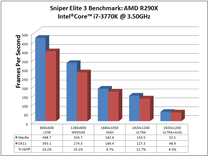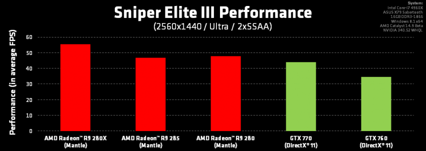 Η υποστήριξη για το Mantle στο Sniper Elite III, πλέον είναι γεγονός. Η Rebellion διέθεσε σήμερα ένα νέο patch για το παιχνίδι το οποίο προσθέτει υποστήριξη για Mantle. Επιπλέον στα extras του παιχνιδιού έχει προστεθεί και ένα νέο benchmark mode, ώστε ο καθένας να μπορεί να δει τα πλεονεκτήματα της χρήσης του API της AMD από πρώτο χέρι. Σύμφωνα με τις δοκιμές της ίδιας της Rebellion η χρήση του Mantle έναντι του DirectX 11 πρόσφερε τα παρακάτω πλεονεκτήματα