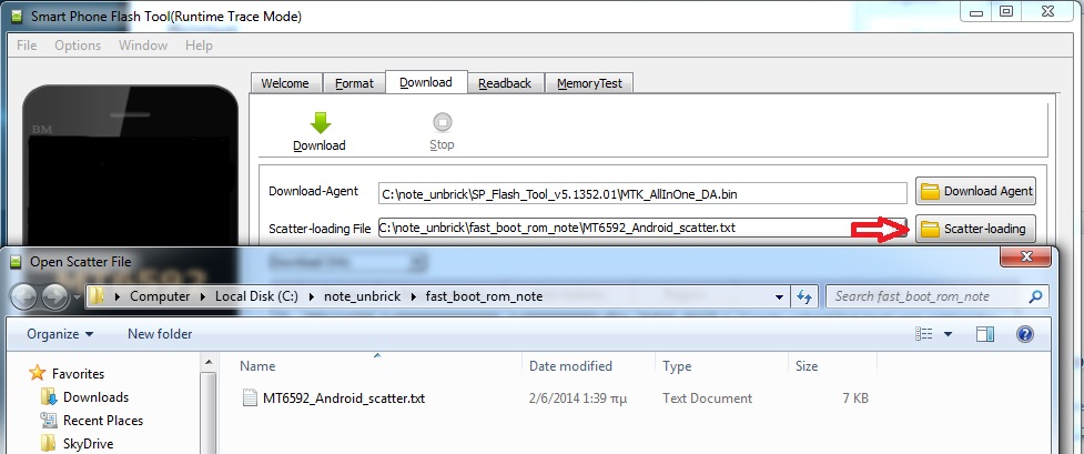 Πατάμε το κουμπί δεξιά που γράφει Scatter Loading και επιλέγουμε από τους φακέλους αυτόν με το όνομα note_unbrick\fast_boot_rom_note