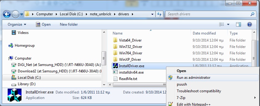 Μπαίνουμε στο φάκελο drivers και τρέχουμε το αρχείο InstallDriver.exe κάνοντας δεξί κλικ επάνω του και επιλέγοντας Run as Administrator.