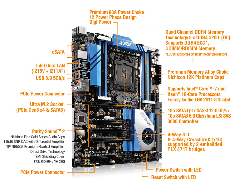 Η νέα μητρική από την ASRock υποστηρίζει τόσο επεξεργαστές Core i7 της σειράς 5000 (Haswell-E), όσο και Xeon E5-2600/1600 (Haswell-EP). Έχει οκτώ υποδοχές για μνήμη DDR4 3200+ OC με υποστήριξη quad channel και μπορεί να δεχτεί τόσο UDIMMs όσο και RDIMMs και ECC υποστήριξη(με τους Intel Xeon). Η μέγιστη μνήμη που μπορεί κάποιος να χρησιμοποιήσει είναι 128GB (8x16GB). Επιπλέον υποστηρίζει τόσο quad Crossfire όσο και quad SLi. Αλλά το ιδιαίτερο χαρακτηριστικό της που την κάνει να ξεχωρίζει, είναι η ύπαρξη 18 SATA III υποδοχών!