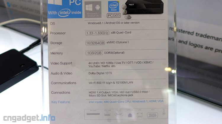 Μία από αυτές τις συσκευές είναι και το PCG03 TV Box/MiniPC που παρουσίασε στο Hong Kong Electronics Fair, η Κινεζική Mele Digital Technology Ltd. Το PCG03 θα χρησιμοποιεί τον quad core Intel Atom Z3735D ο οποίος έχει base συχνότητα λειτουργίας τα 1.3GHz και Turbo στα 1.83GHz, 1 ή 2 GB RAM DDR3, 16, 32 ή 64GB αποθηκευτικού χώρου τύπου eMMC, επεκτάσιμου μέσω microSD slot, HDMI 1.4, VGA και composite. Επιπλέον διαθέτει 10/100M ethernet θύρα, 802.11 b/g/n WiFi και δύο USB 2.0 υποδοχές.