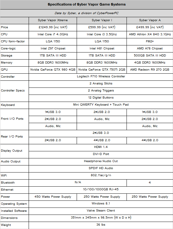 Το Syber Vapor έρχεται σε τρία configurations με το φτηνότερο να κοστολογείται στις 500 λίρες και το ακριβότερο στις 1250 λίρες, συμπεριλαμβανομένου του φόρου. Δίνεται πάντως η δυνατότητα κάποιος να φτιάξει την δική του custom σύνθεση στην ιστοσελίδα της εταιρίας. Τα εξαρτήματα άλλωστε ενός Syber Vapor, είναι τα ίδια με αυτά που βρίσκουμε στο ράφι ενός καταστήματος, οπότε είναι εύκολο ο κάτοχος ενός Syber Vapor συστήματος να το αναβαθμίσει. Για λειτουργικό χρησιμοποιούνται τα Windows 8.1 της Microsoft κάτι που σημαίνει ότι δεν υπάρχει περιορισμός, όσον αφορά την βιβλιοθήκη των games, σε αυτή του Steam. Τα συστήματα είναι συμβατά και με UPlay, Battle.net, Origin ή Windows Games Library.