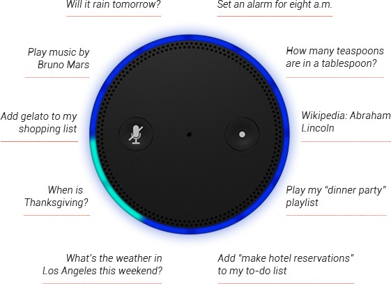 Η συσκευή είναι voice activated, μόνιμα συνδεδεμένη στο cloud και έχει την δυνατότητα να ακούσει μια φωνητική εντολή ακόμα και από την άλλη άκρη του δωματίου, χάρη στα μικρόφωνα που διαθέτει. Ο κάτοχός της μπορεί με μια απλή εντολή, να ζητήσει κάποιες πληροφορίες για κάποιο θέμα, να ξεκινήσει η αναπαραγωγή μουσικής της επιλογής του, να ακούσει τους τίτλους των ειδήσεων ή να ενημερωθεί για τον καιρό, να ενημερώσει την λίστα με τα πράγματα που έχει να κάνει ή τα προϊόντα που σκοπεύει να αγοράσει, να βάλει ξυπνητήρι ή χρονόμετρο. Επιπλέον έχει δυνατότητες streaming μουσικής μέσω WiFi ή από το κινητό ή το tablet, μέσω Bluetooth.