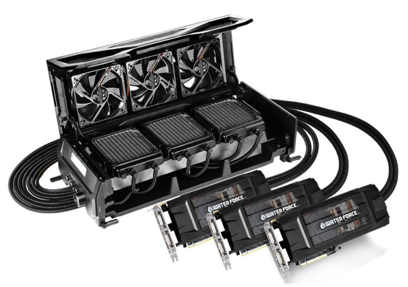 Είναι φανερό ότι η Gigabyte θέλει να μας εντυπωσιάσει, ως εκ τούτου παρουσίασε πρόσφατα μια νέα υλοποίηση που φέρει την κωδική ονομασία GeForce GTX 980 WaterForce Tri-SLI (μοντέλο: GV-N980X3WA-4GD) και η οποία υπόσχεται να προσφέρει κορυφαίες επιδόσεις. Φυσικά κάτι τέτοιο, θα επιτευχθεί μέσω των τριών καρτών GeForce GTX 980 οι οποίες έρχονται εξοπλισμένες ήδη με υδροψύξεις και είναι εργοστασιακά υπερχρονισμένες. Πιο συγκεκριμένα, οι συχνότητες του πυρήνα των GTX 980 φθάνουν τα 1228 MHz, η GPU αγγίζει τα 1329 MHz (Boost) ενώ η μνήμη είναι χρονισμένη στα 7.00 GHz.
