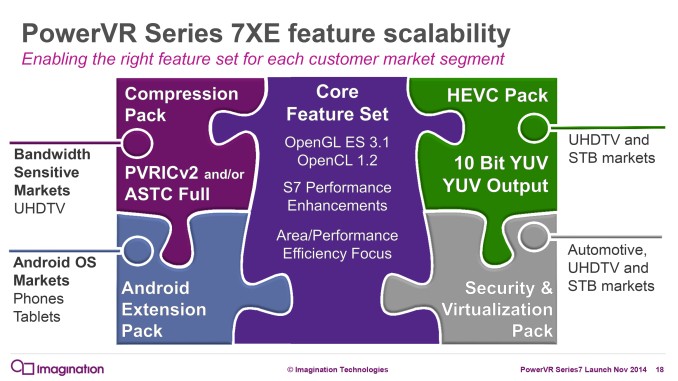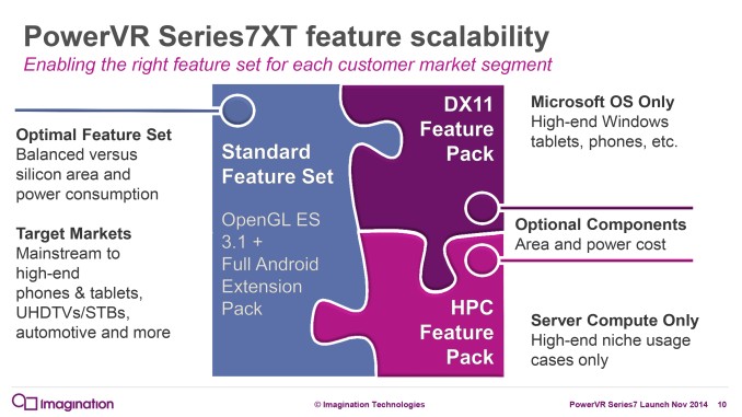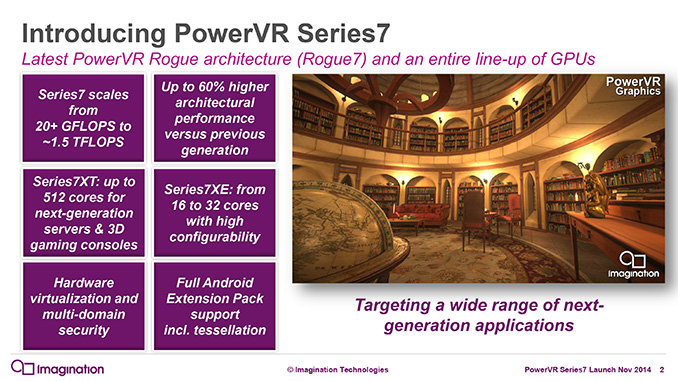 Όπως και στην περίπτωση της σειράς 6, θα υπάρχουν δύο εκδόσεις, πιο συγκεκριμένα οι 7XT και 7XE. Και οι δύο θα υποστηρίζουν Android Expansion Pack (AEP), virtualization, high-quality texture compression και πλήρως το OpenGL ES 3.1. Το AEP είναι ένα νέο χαρακτηριστικό το οποίο παρουσιάστηκε με το Android 5.0 Lolipop, με στόχο την δημιουργία γραφικών επιπέδου desktop υπολογιστή. Το virtualization χρειάζεται ώστε να κρατά τις διαφορετικές εφαρμογές χωριστά και να βελτιώσει την ασφάλεια προσθέτοντας ένα επιπλέον layer ανάμεσα σε αυτές και το hardware, ενώ το Tessellation χρησιμοποιείται για την αύξηση της λεπτομέρειας στα τρισδιάστατα γραφικά.