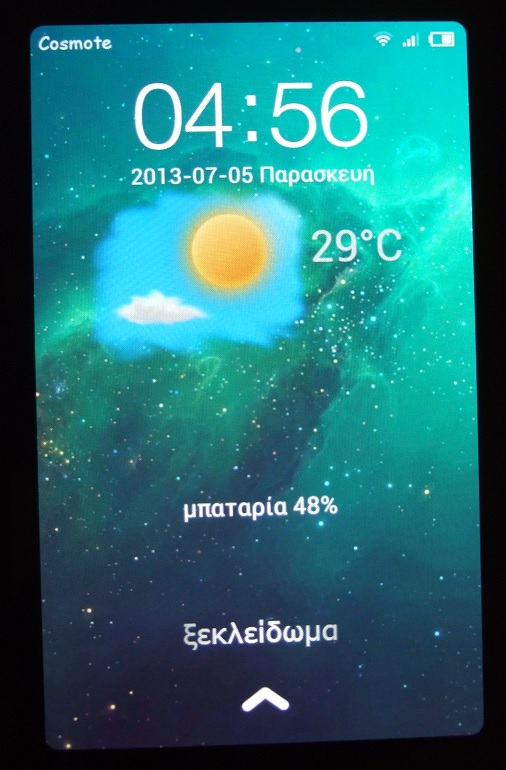 Η lockscreen εχει επιπλεον θεμα καιρού miui (με weather BZ για miui v5 δουλευει ) και επισης εχω βαλει να φαινεται το ποσοστο μπαταριας κινητου και σε κατασταση εκτος φορτισης (2η φωτο) .Ακομα μπηκε σε σωστη θεση και η λεξη "ξεκλειδωμα " για να μην πεφτει πανω στα κουμπια ελεγχου της μουσικης.