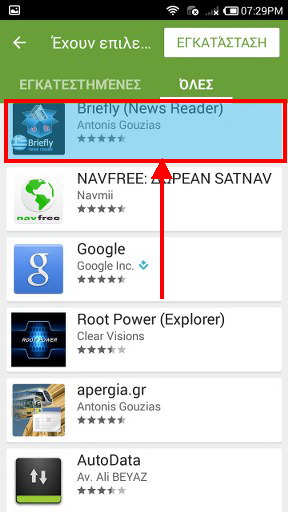 Εκεί λοιπόν, πατώντας παρατεταμένα πάνω σε οποιαδήποτε εφαρμογή (που ΔΕΝ είναι εγκατεστημένη στη συσκευή μας την δεδομένη στιγμή), την επιλέγουμε και συγχρόνως μπαίνουμε σε mode πολλαπλής επιλογής. Στην συνέχεια με ένα απλό πάτημα επιλέγουμε όσες εφαρμογές θέλουμε να εγκαταστήσουμε, ανεξάρτητα απο τον αριθμό τους και τέλος πατάμε το κουμπί "ΕΓΚΑΤΑΣΤΑΣΗ" πάνω δεξιά.