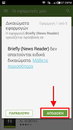 Στην συνέχεια (είναι το πιό βαρετό, αλλά απαραίτητο βήμα) τα "δικαιώματα εφαρμογών" θα αρχίσουν να μας ρωτάνε εάν αποδεχόμαστε τους όρους και εάν "ναι" να πατήσουμε το αποδοχή. Εφ'όσον ομως πρόκειται για εφαρμογές που είχαμε χρησιμοποιήσει στο παρελθόν και άρα τις γνωρίζουμε, είναι αυτονόητο ότι αποδεχόμαστε τους όρους, άρα, πατάμε γρήγορα και επαναλαμβανόμενα το κουμπί "ΑΠΟΔΟΧΗ" που θα εμφανίζεται εναλλάξ στην οθόνη μετά απο κάθε αποδοχή...
