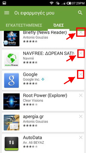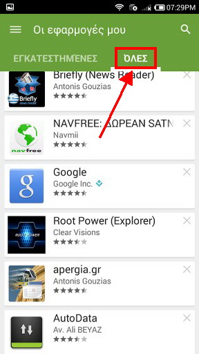 Ανοίγουμε το Google Play και πάμε στο tab "ΟΛΕΣ", στην επιλογή "Οι εφαρμογές μου".