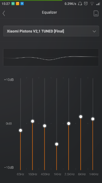 Είπα να βάλω το Mi Enchancement και να επιλέξω τα Pistons V2. Προς μεγάλη μου έκπληξη όμως ο ήχος έγινε χειρότερος, με συχνότητες γύρω στο 1ΚHz να γίνονται υπερβολικά δυνατές. Πειραματίστηκα λοιπόν με το EQ των settings, και με On-Off το Enchancement, και κατέληξα πως αν αφαιρέσεις το peak στα 1KHz, το Enchancement κάνει και κάτι έξτρα στον ήχο, το οποίο βελτιώνει την απόδοση των ακουστικών.