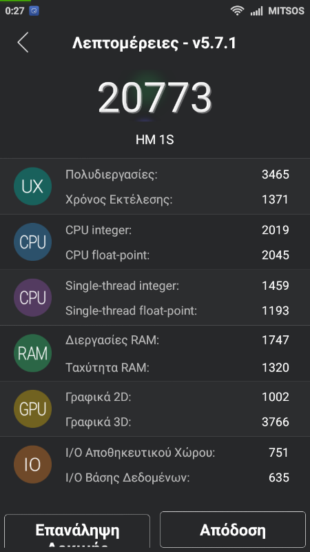 OK είμαστε πλέον σε miui 7 αν και πήγε να γίνει ή στραβή γιατί με κούνησε ή μικρή και με το που άνοιξε το τηλ. πάτησα άλλη γλώσσα αλλά όλα καλά!!! Δεν μπόρεσα να βρω πως φαίνεται αν έχει σήμα 3g ή 2g. 489mb free ram πάντως, δεν θυμάμαι να έχω ξαναδεί στο 1s. δείχνει να διαχειρίζεται καλύτερα την ραμ. Μου έκανε εντύπωση ότι από το mi cloud δεν δούλεψαν όλα π.χ. οι κωδικοί από wifi, μηνήματα. Δείτε και τα αποτέσματα από antutu, έτσι από περιέργεια.