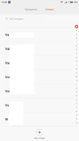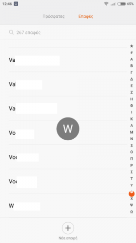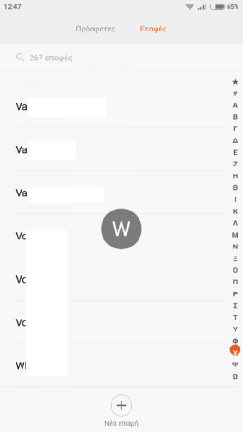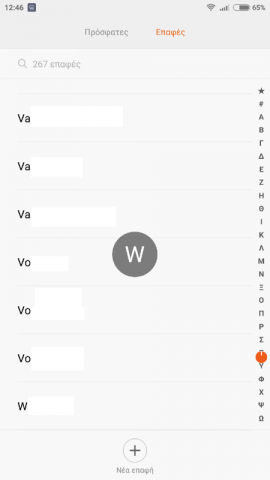 βαζω και εγω μερικα screenshots !οπως θα δειτε μεχρι το "Σ"ολα καλα,απο δεξια στην οθονη οταν επιλεγεις τα γραμματα Τ,Υ,Φ,Χ,Ψ,Ω μου εμφανιζει τις ιδιες επαφες καθε φορα που αρχιζουν με το αγγλικο "V" και οταν αφηνω τραβαω το δαχτυλο απο την οθονη με πεταει στον αστερισκο που φαίνεται στη τελευταια φωτο!