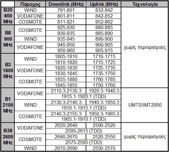 Στην Ελλάδα λειτουργούν τρεις εταιρείες κινητής τηλεφωνίας, οι εταιρείες COSMOTE, WIND και VODAFONE. Τα δίκτυα τους χρησιμοποιούν ζώνες συχνοτήτων περί τα 800 MHz, 900 MHz, 1800 ΜΗz, 2100 MHz και 2600 ΜΗz. Ο παρακάτω πίνακας παρουσιάζει με λεπτομέρεια τις υπηρεσίες που τα δίκτυα αυτά παρέχουν και το αντίστοιχο απονεμηθέν φάσμα. Η δεύτερη στήλη αναφέρεται στο downlink, δηλαδή στις συχνότητες στις οποίες εκπέμπει ο σταθμός βάσης. Η τρίτη στήλη αντιστοιχεί στο uplink, δηλαδή στις συχνότητες όπου ο σταθμός βάσης λειτουργεί για τη λήψη σήματος. Στην τέταρτη στήλη, καταγράφεται η τεχνολογία η οποία μπορεί να χρησιμοποιηθεί για κάθε ζώνη συχνοτήτων. Η ένδειξη «χωρίς περιορισμούς» υποδεικνύει ότι κάθε εταιρεία μπορεί να επιλέξει χωρίς περιορισμούς την τεχνολογία που επιθυμεί να χρησιμοποιήσει υπό την προϋπόθεση τήρησης των τεχνικών όρων που αναγράφονται στο σχετικό Δικαίωμα Χρήσης Ραδιοσυχνότητας, εξασφαλίζοντας ταυτόχρονα ότι τα συστήματά της δε δημιουργούν παρεμβολές σε άλλους νόμιμους χρήστες του ραδιοφάσματος και παρέχουν κατάλληλη προστασία σε συστήματα παρακείμενων ζωνών του ραδιοφάσματος