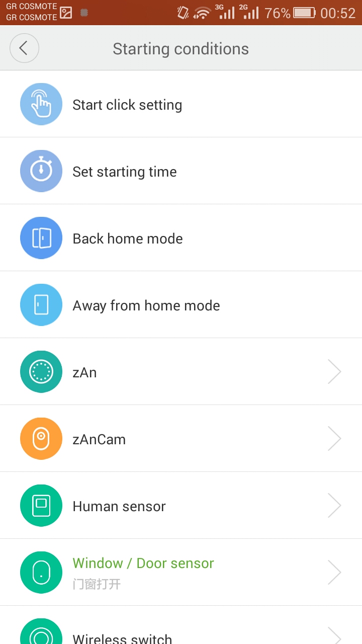 Θα βάλω ένα παράδειγμα να ακουγεται ήχος οταν ανοίγει η πόρτα με τον window /door sensor. Τα βήματα και οι επιλογές είναι ίδιες και για τον σενσορα σώματος. Τα διαθέσιμα scenes είναι στο προτελευταίο screenshot όπου με red letters είναι η μετάφραση. Αφού επιλέξουμε το scene που θέλουμε, επιλέγουμε completed και save. Με τον ίδιο τρόπο μπορούμε να προσθέσουμε και άλλα scenes. Πχ Έχω βάλει επισης οταν ανοίγει η πόρτα να ανάβει και το φως του getaway και οταν κλείνει να σβήνει.