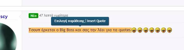 Μαρκάρετε στο κείμενο αυτό που θέλετε ως Quote και είτε κάνετε άμεσο Insert ή επιλογή παράθεσης όσων θέλετε σε διάφορα Post και μετά προχωράτε στην απάντηση...