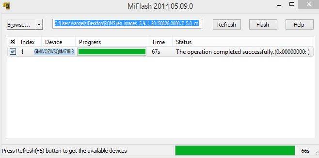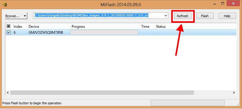 Πάμε στο ήδη ανοιχτό MiFlash και πατάμε το κουμπί resfresh. Αν όλα πάνε καλά θα δούμε στην οθόνη του MiFlash τον κωδικό αριθμό της συσκευής μας: