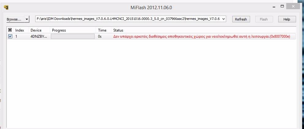 Κάνε unzip το αρχείο της fastboot rom στο C:/ χύμα. Να φαίνεται έτσι: C:\hermes_images_V7.0.6.0.LHMCNCI_20151016.0000.3_5.0_cn στον διευθυνσιογράφο του MiFlash.Και ξαναπροσπάθησεΟ/H arisg88 έγραψε: