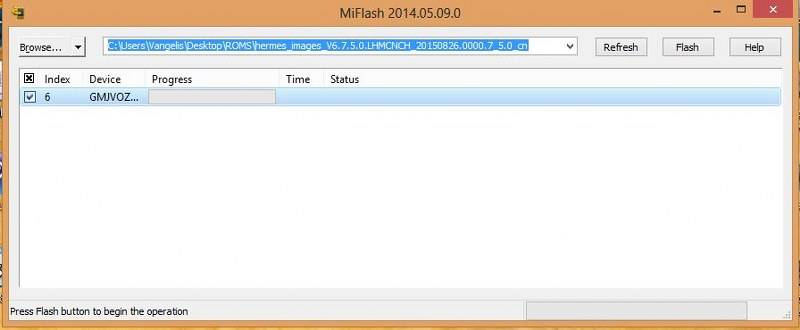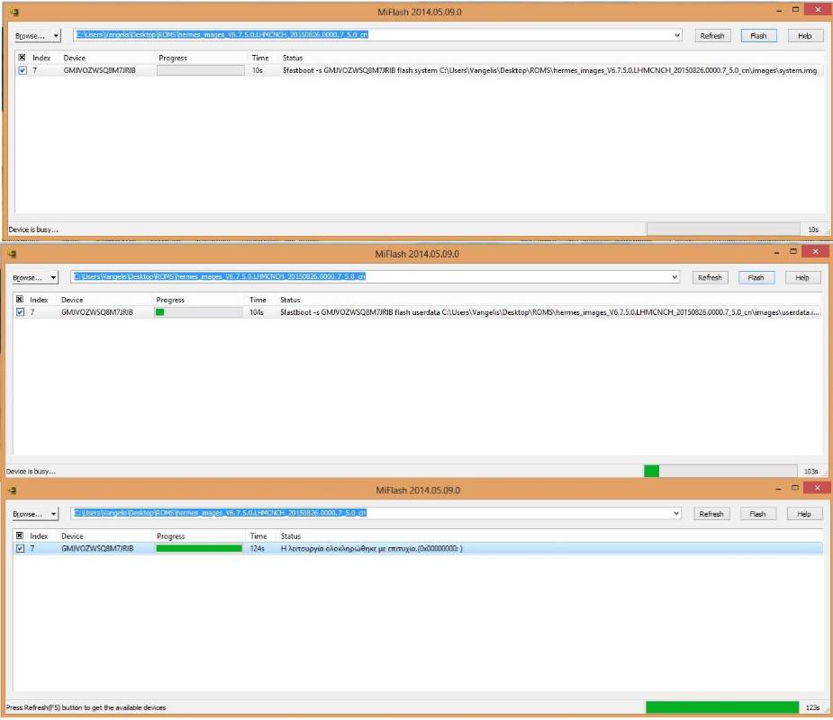 Αφού έχουμε φροντίσει να φορτίσουμε τη συσκευή μας ΠΑΡΑ ΠΟΛΥ (μέχρι και 100% θα έλεγα, αλλά και το 70% είναι αποδεκτό) κατεβάσουμε την τελευταία fastboot rom όπως είπαμε παραπάνω, την αποσυμπιέζουμε κάπου μέσα στον υπολογιστή μας (κατά προτίμηση χύμα μέσα στο C:/ έτσι ώστε η διαδρομή που θα μπει στο MiFlash να είναι όσο το δυνατόν μικρότερη. Δηλαδή η διαδρομή που θα φαίνεται ο φάκελος να είναι κάπως έτσι: C:\hermes_images_V7.0.6.0.LHMCNCI_20151016.0000.3_5.0_cn).