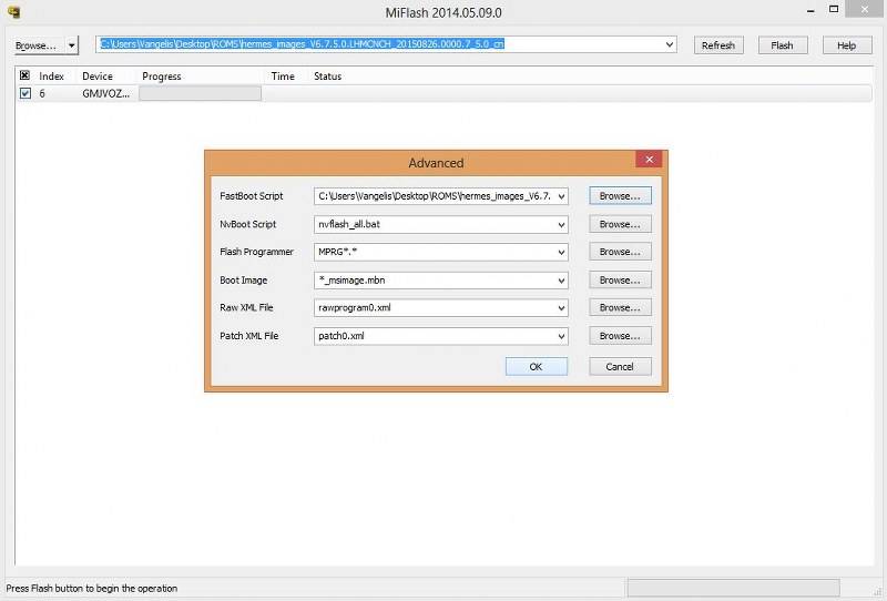 Ανοίγουμε το πρόγραμμα MiFlash (που κατεβάσαμε προηγουμένως και εγκαταστήσαμε στον υπολογιστή μας) και απο το Browse του προγράμματος, εντοπίζουμε το φάκελο που αποσυμπιέσαμε την rom και τον ανοίγουμε πατώντας το οκ στον wizard. Αυτομάτως στον διευθυνσιογράφο του MiFlash θα μπει η διαδρομή που βρίσκεται η rom.