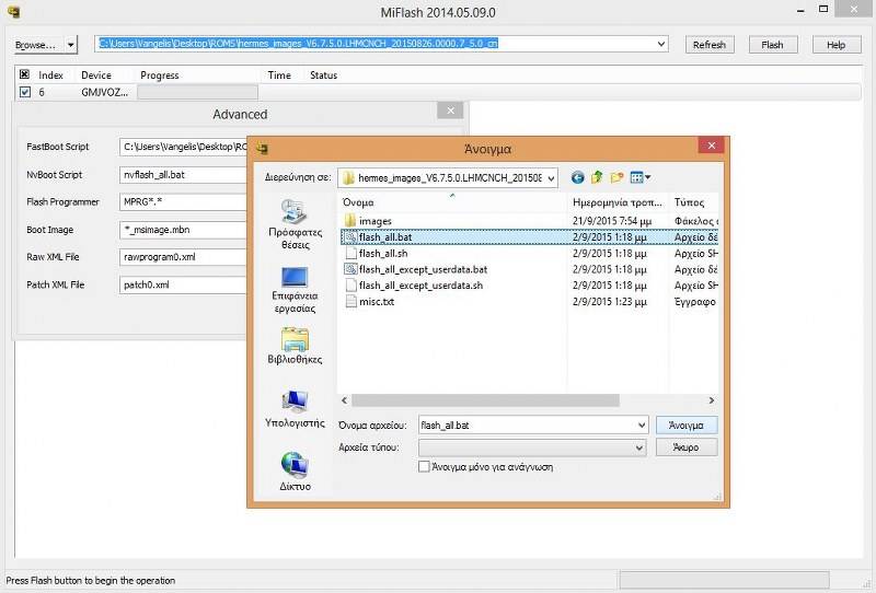 Το πατάμε, και ψάχνουμε να βρούμε το φάκελο με τη rom, βρίσκουμε το αρχείο "flash_all.bat", το μαρκάρουμε να γίνει μπλε και πατάμε το κουμπί "άνοιγμα".